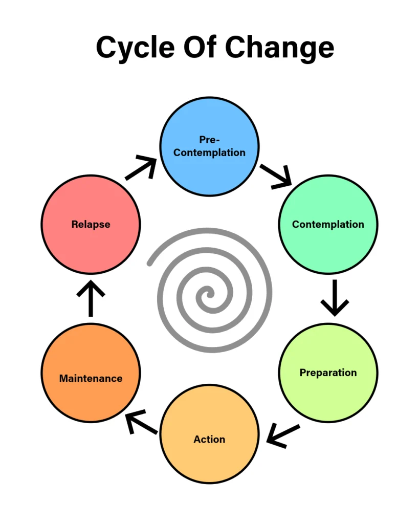 - Relapse: We slip properly back into the old behaviour, where we are no longer working towards change. We can decide to try again or to continue with the old behaviour.